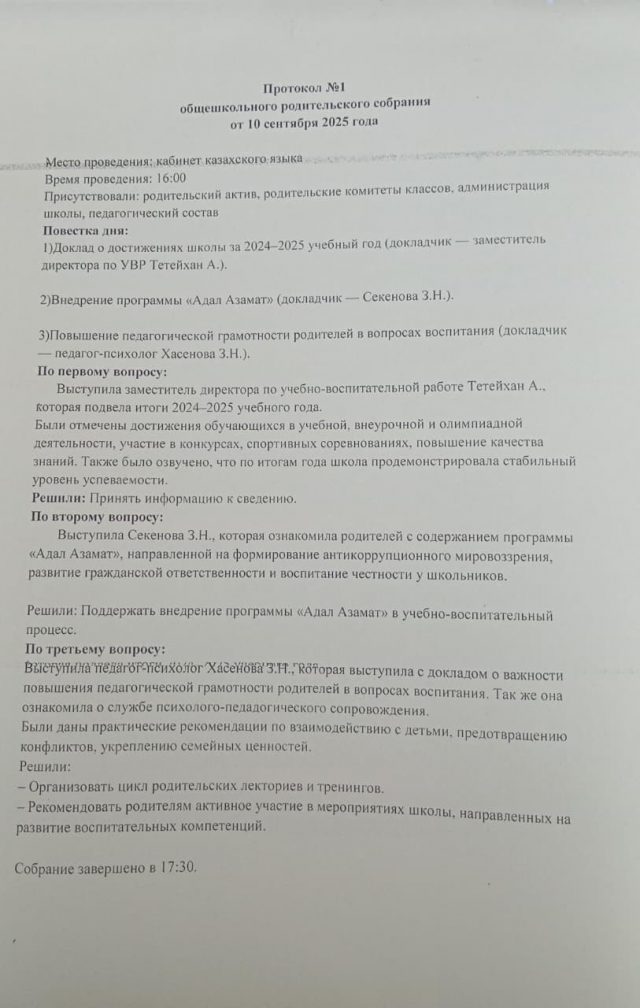2025 жылғы 10 қыркүйектегі жалпы мектепішілік ата-аналар жиналысының № 1 хаттамасы